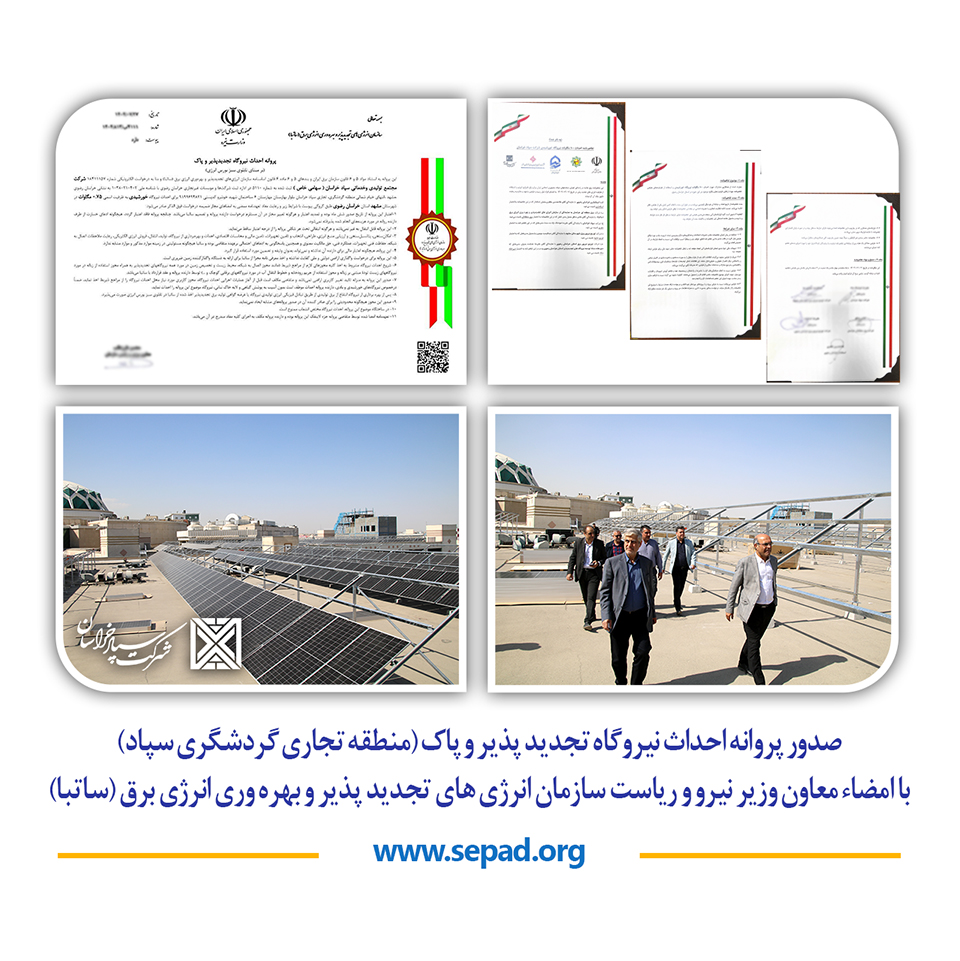 صدور پروانه احداث نیروگاه تجدید پذیر و پاک (منطقه تجاری گردشگری سپاد) با امضاء معاون وزیر نیرو و ریاست سازمان انرژی های تجدید پذیر و بهره وری انرژی برق (ساتبا)